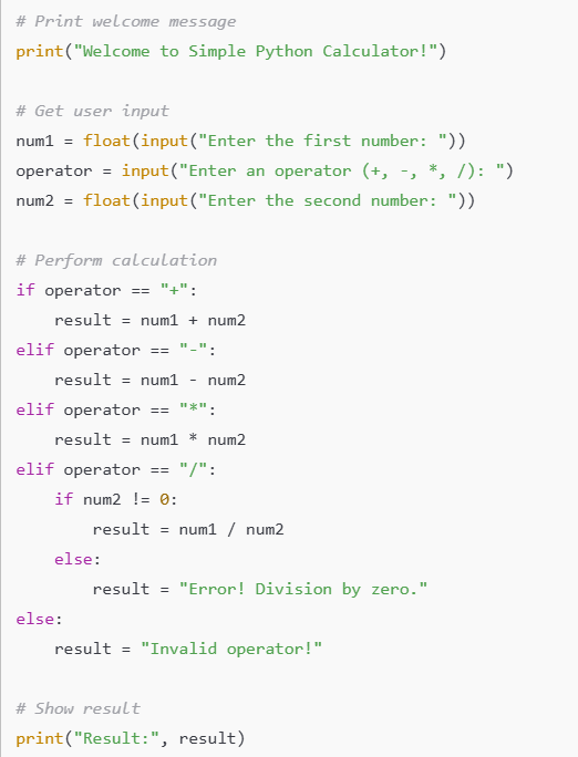Example mini-project: A beginner-friendly Python calculator that handles addition, subtraction, multiplication, and division, checks for division by zero, and uses simple input and output.